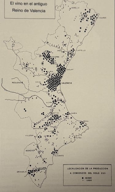 Localització de la producció vinícola al començament del segle XVII a la Comunitat Valenciana