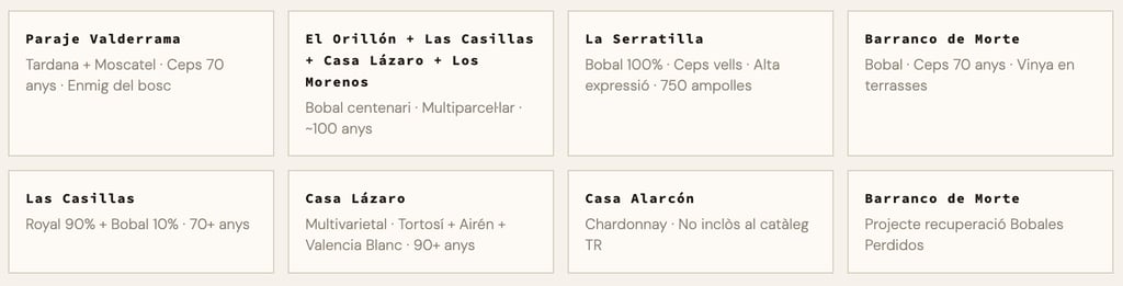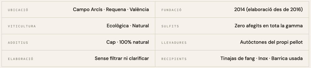 El que fa especialment valuós el treball de Juan i Susana a Camp Arcís és la recuperació de vinyes velles que ningú volia: el Bobal centenari de parcel·les multiparcel·lars, la Tardana de 70 anys enmig del bosc de Valderrama, la Royal i les tres varietats quasi oblidades de Casa Lázaro. Cadascun d'aquests vins és, d'alguna manera, un acte de resistència contra l'homogeneïtzació del paisatge vitivinícola.