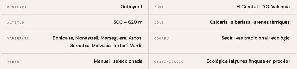 Varietats autòctones quasi desaparegudes, sòls calcaris d'interior i la reivindicació clara d'una identitat vitivinícola que el món no coneix prou. Des d'Ontinyent.
