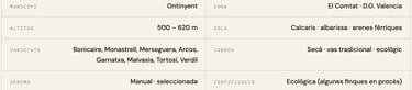 La seua aposta per les varietats autòctones quasi desaparegudes — Bonicaire, Merseguera, Arcos, Forcallà Blanca, Verdil — no és una operació de màrqueting. És convicció. La certesa que la identitat d'un territori es guarda en les varietats que els vells viticultors van saber mantenir i que la indústria va ignorar durant dècades.