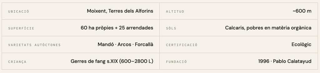 Celler del Roure neix el 1996 com un projecte familiar a Moixent, a les Terres dels Alforins. Des del principi, Calatayud treballa en ecològic i inicia una investigació de dècades per recuperar varietats gairebé desaparegudes: la Mandó, la Arcos, la Forcallà. Varietats que el granel havia abandonat perquè donen poc color, poca graduació i vénen tard —"arcos és veremava per Tots Sants", diuen els majors del poble. Varietats, però, que en les mans adequades parlen d'un Mediterrani completament diferent: més fresc, més mineral, més lluminós.