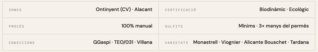 L'arquitectura del projecte és la seua gran singularitat: tres col·leccions amb identitat pròpia. GGaspi treballa la Monastrell a Ontinyent des de la biodinámica estricta, amb dos expressions de sòl — albarissa i arenes — i un Blanc de Noir que ha aconseguit 93 punts de James Suckling. TEO/031 explora el Viognier i l'Alicante Bouschet a Alacant, amb una edició limitada de barrica premiada pels sumillers alacantins. Villana recupera la Tardana, varietat autòctona valenciana quasi oblidada.