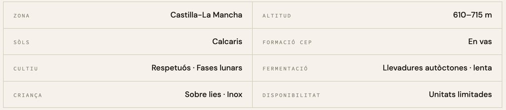 La vinya es treballa amb agricultura respectuosa: ceps plantats en got sobre sòl calcari, on les fases lunars i la biodiversitat de l'entorn condicionen el cicle del cultiu. En celler, el principi és el mateix que presideix tot el que hi ha en el catàleg: intervindre el menys possible i deixar que la fermentació faça el seu treball.
